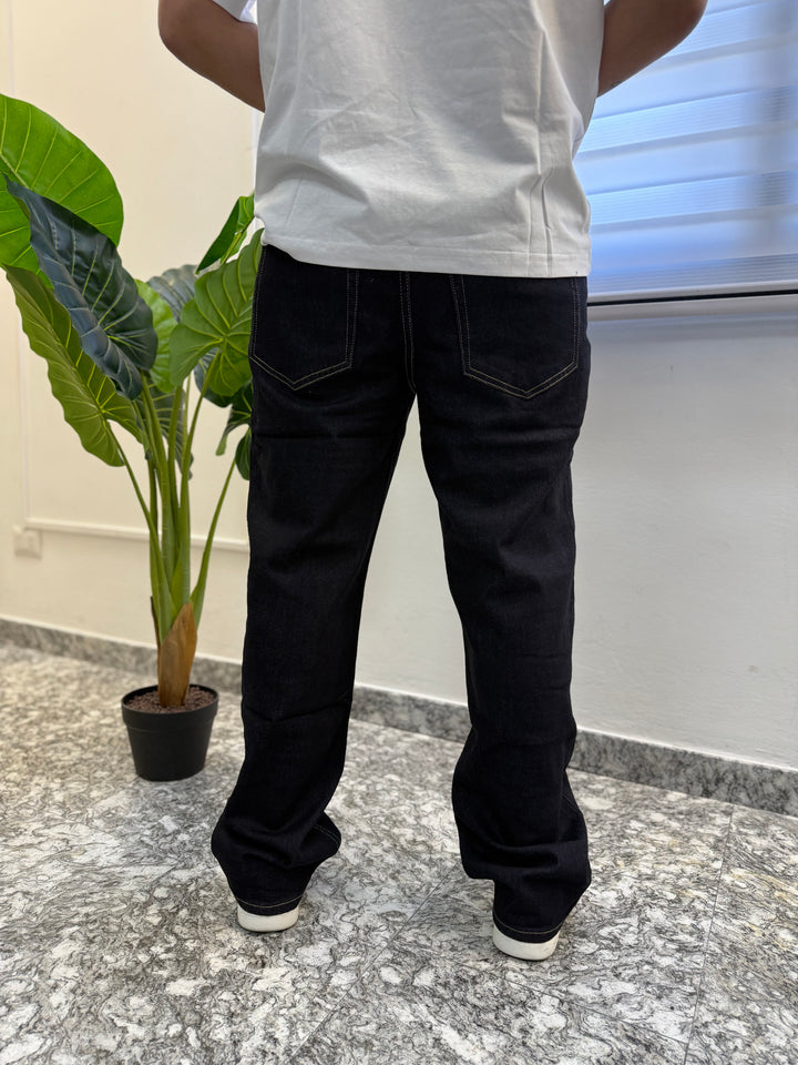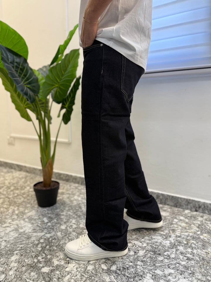 Jeans lavaggio zero con cuciture a contrasto, vestibilità baggy.