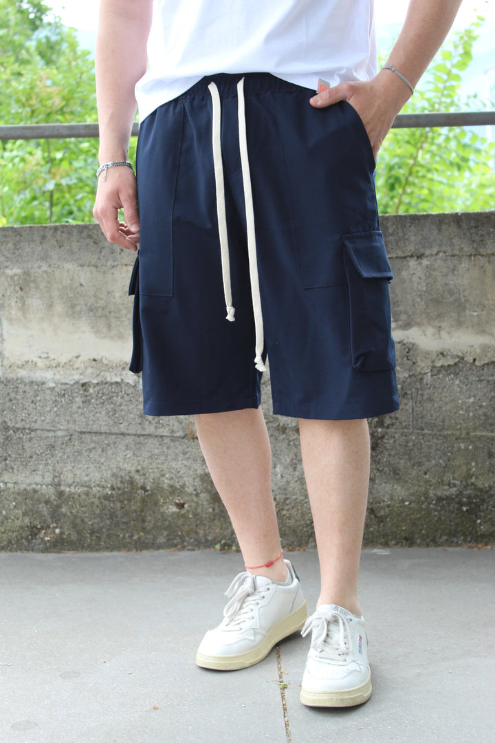 Bermuda misto viscosa con tasconi ed elastico in vita. Il modello in foto è alto 170 x 70 kg e indossa S.