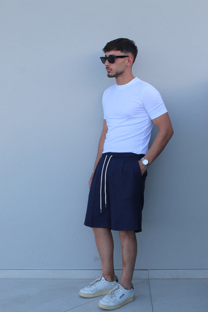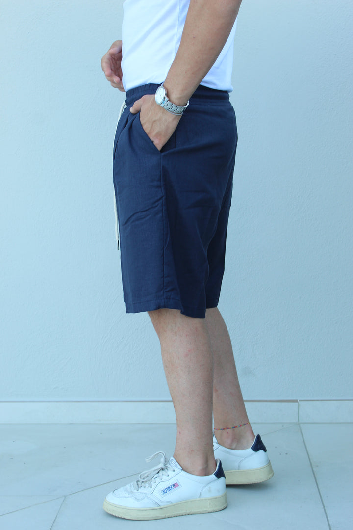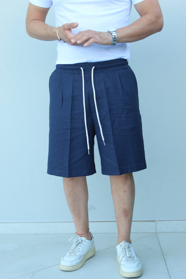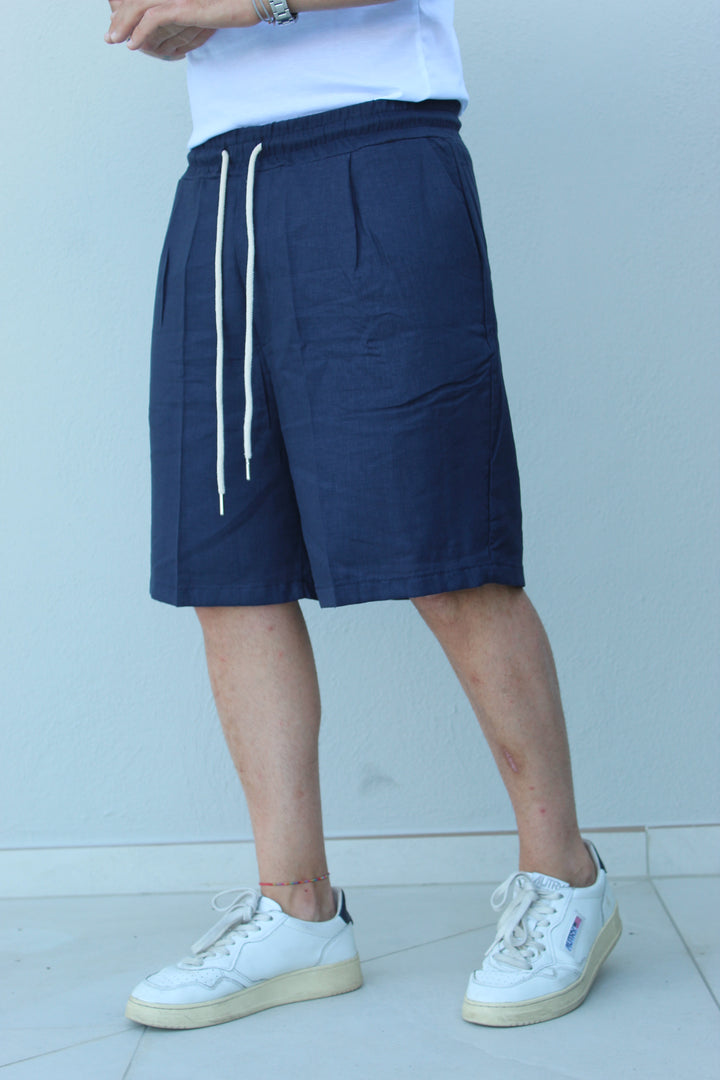 Bermuda in misto lino con elastico in vita e pence. Il modello in foto è alto 170 x 70 kg e indossa S.