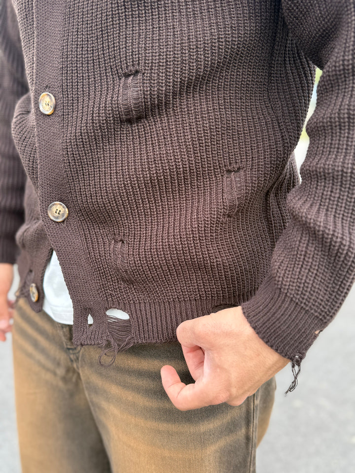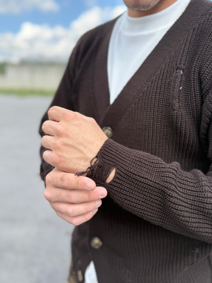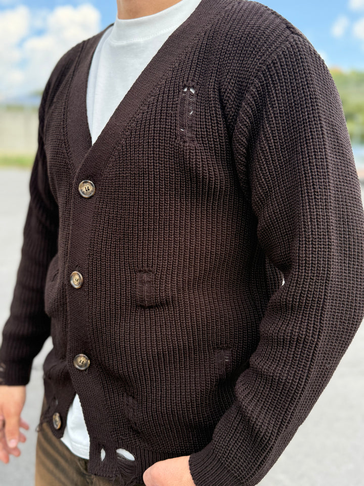 Cardigan colorazione moro con rotture e spalla scesa, regular fit.