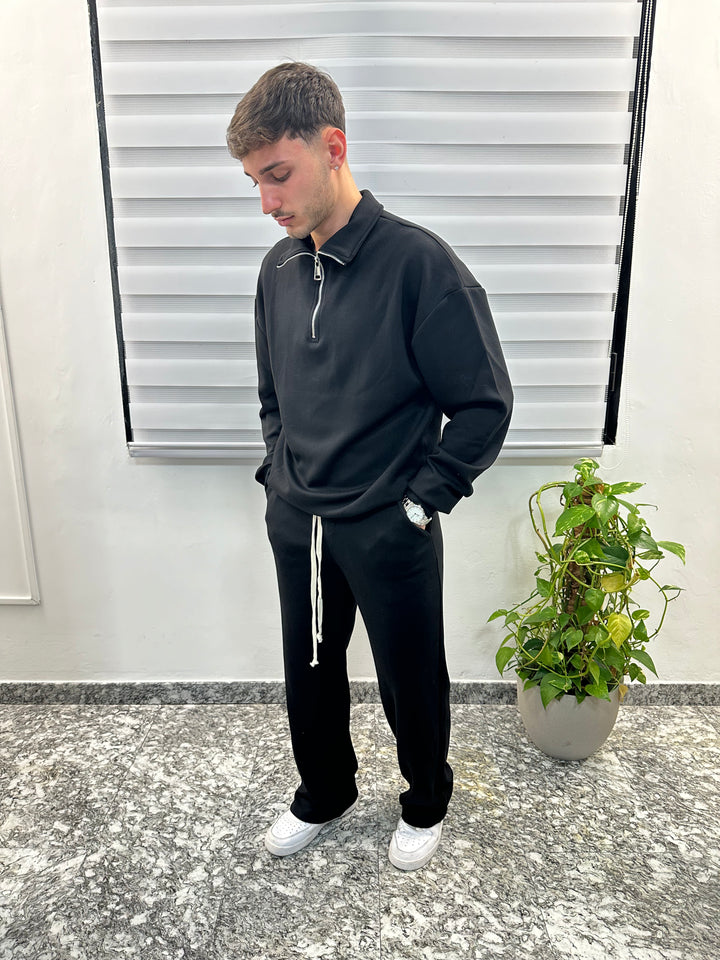 Coordinato in cotone composto da felpa con mezza zip e pantalone con fondo ampio. Il modello è alto 170 x 70 kg e indossa S.