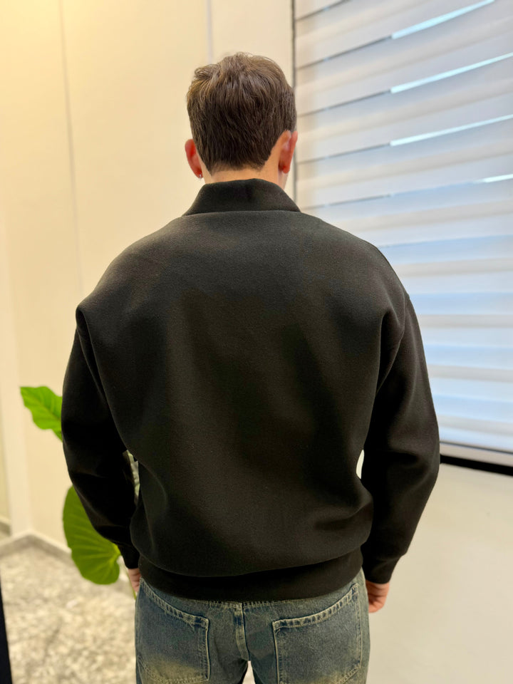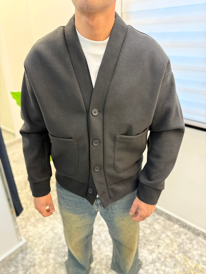 Cardigan in tessuto felpato nero, scollo a V con 4 bottoni.