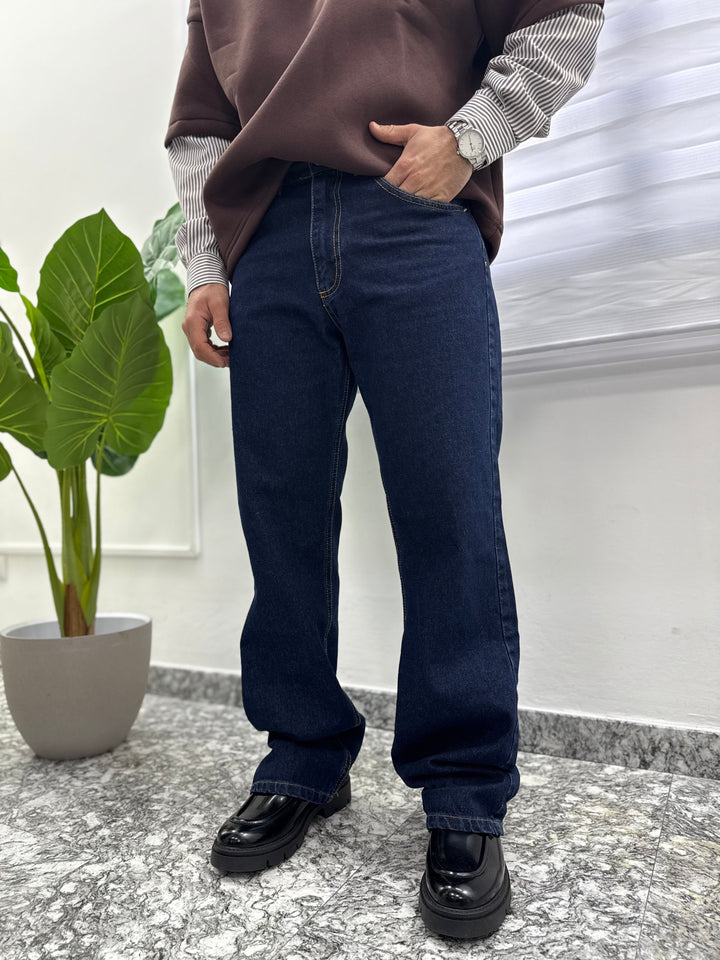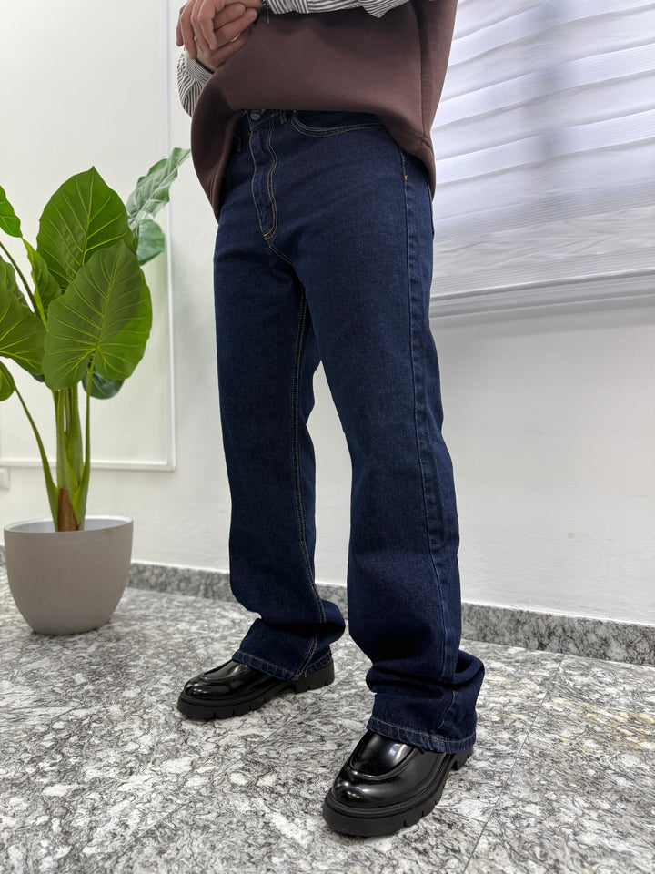 Jeans modello flare, lavaggio scuro con cuciture a contrasto.
