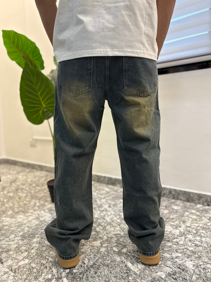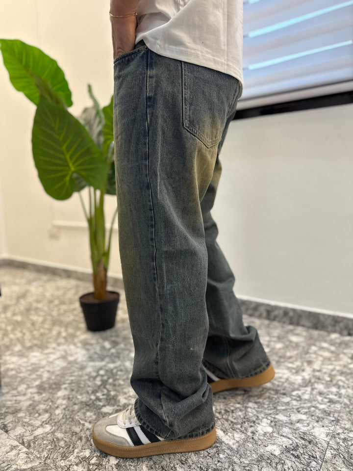 Jeans lavaggio sabbiato, fondo largo, vestibilità baggy.