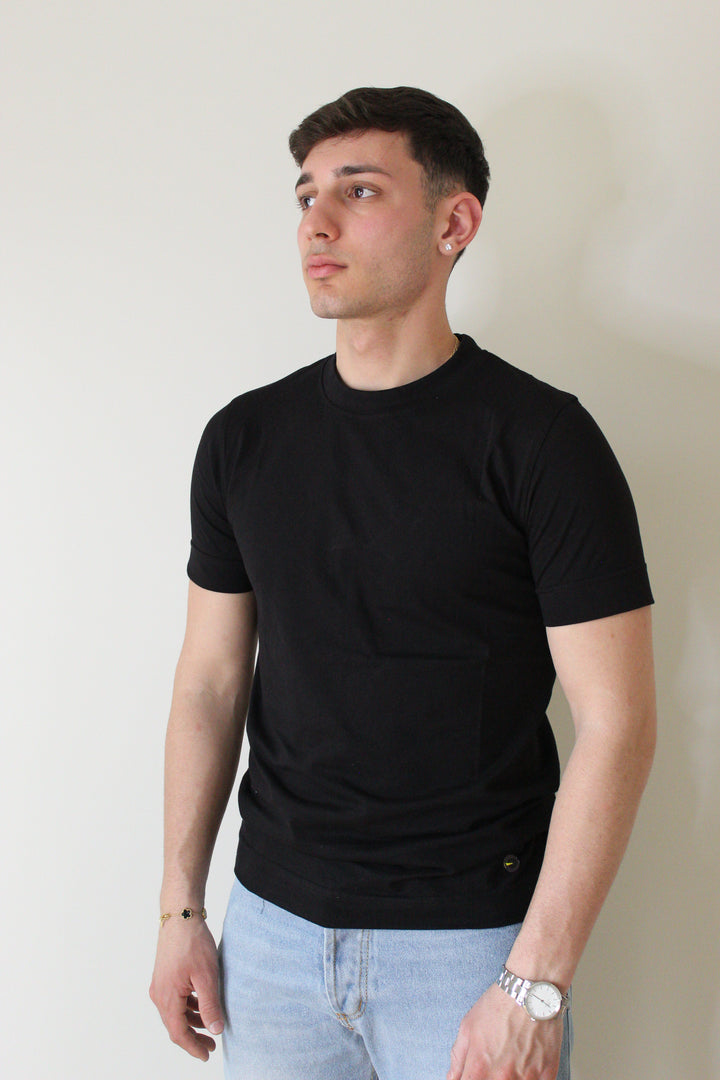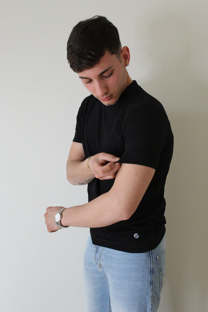 T-shirt 100% cotone, made in italy, sviluppata con una vestibilità regolare. Un capo sia sportivo che elegante in un cotone fresco e resistente. Il modello in foto è alto 1,70 cm e indossa S.