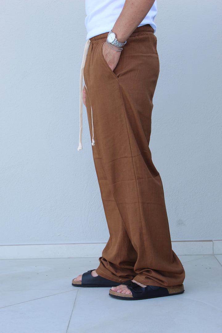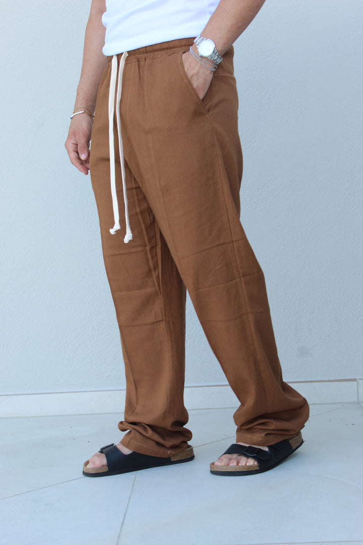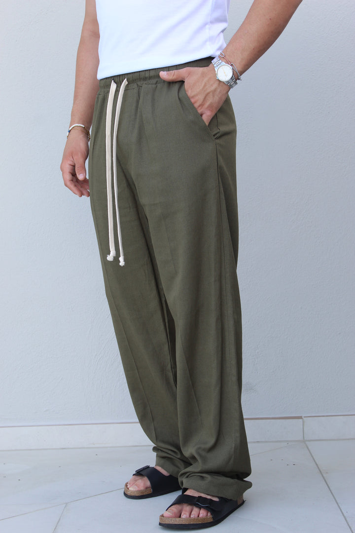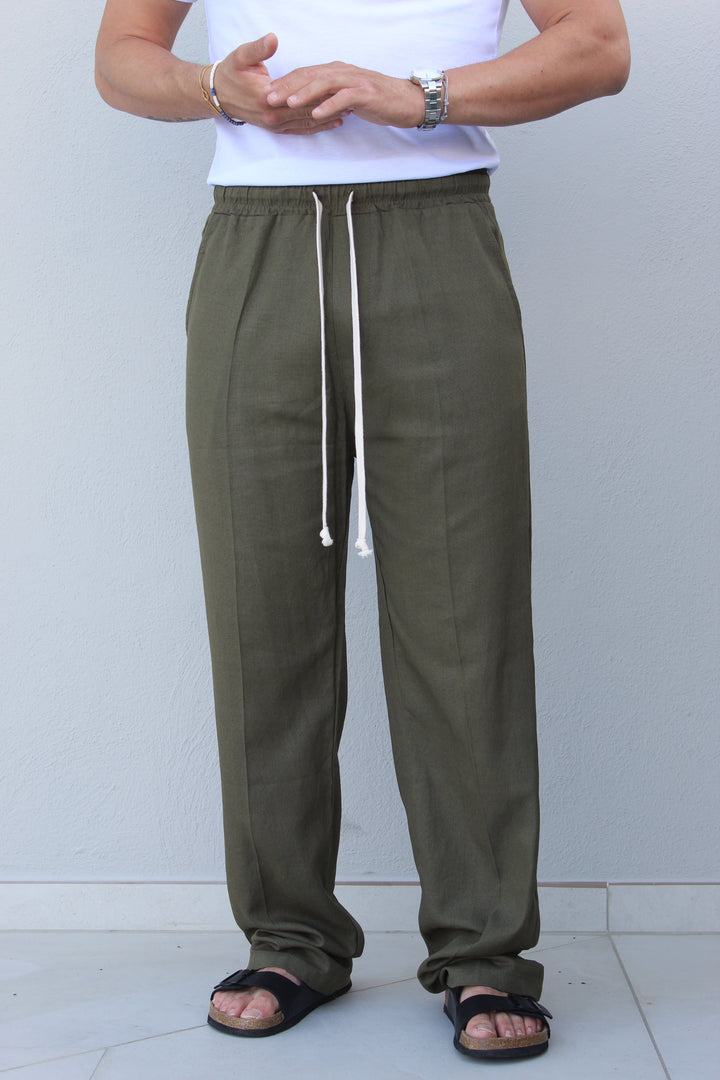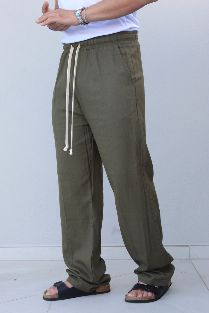 Pantalone modello Japan in misto lino, elastico in vita e fondo ampio. Il modello in foto è alto 170 x 70 kg e indossa S.