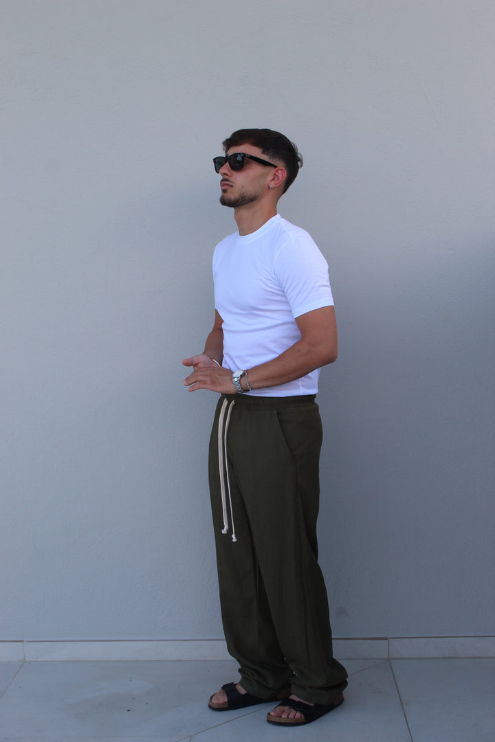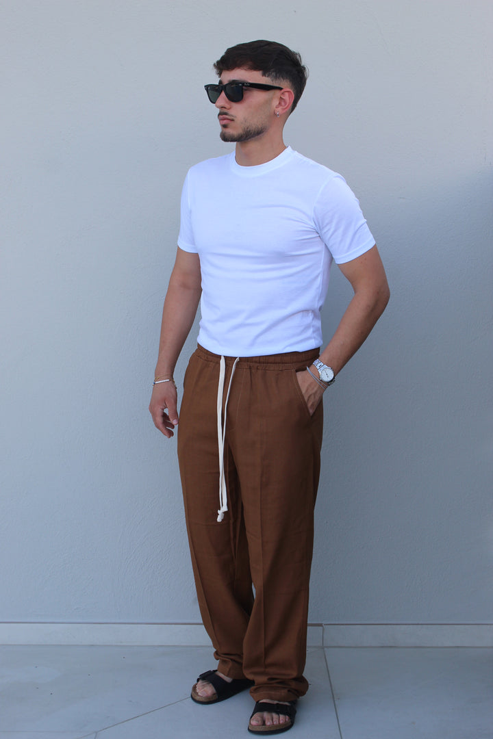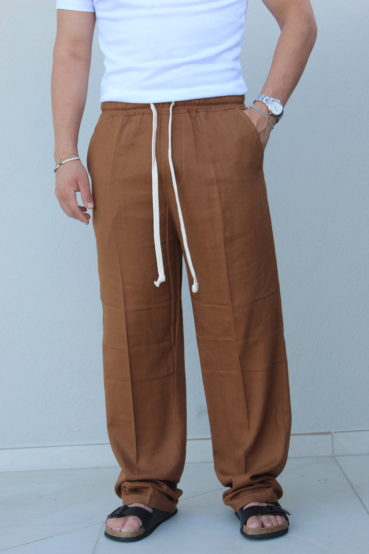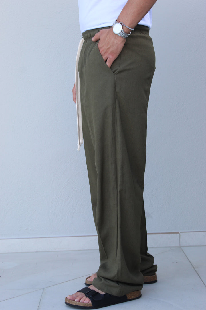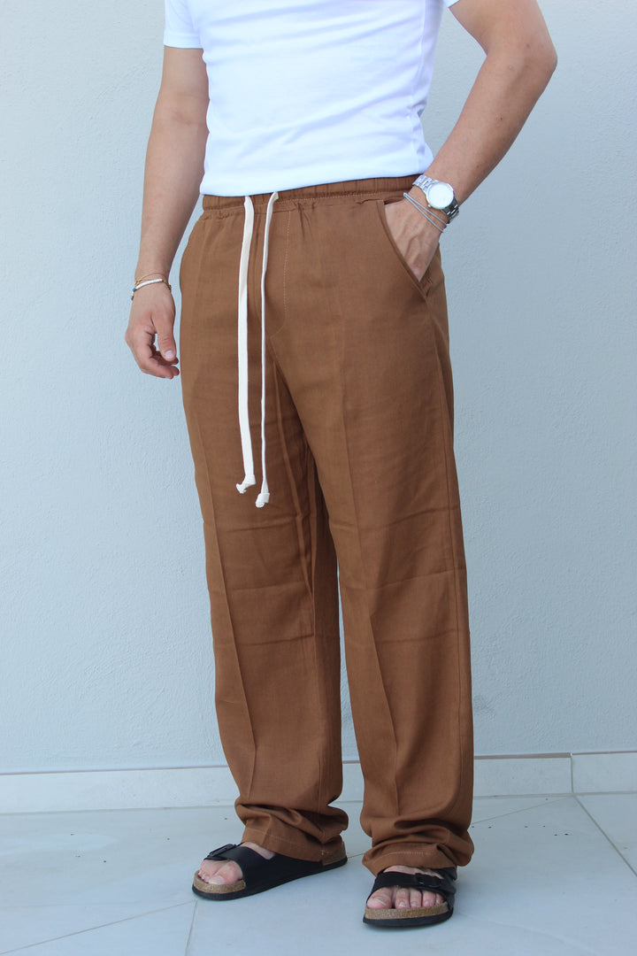 Pantalone modello Japan in misto lino, elastico in vita e fondo ampio. Il modello in foto è alto 170 x 70 kg e indossa S.
