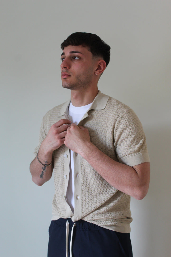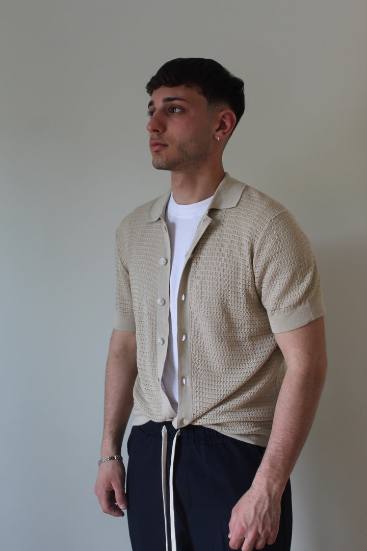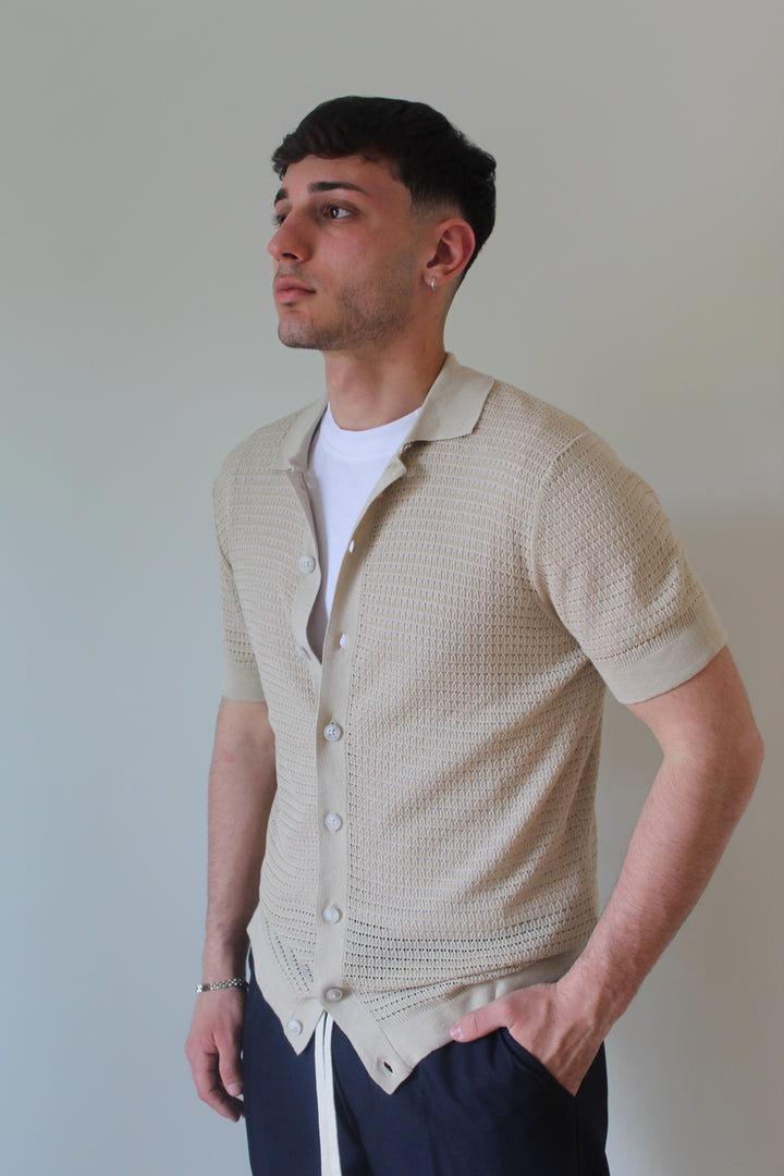 Maglia polo aperta con bottoni, traforata. Il modello in foto è alto 170 x 70 kg e indossa S.