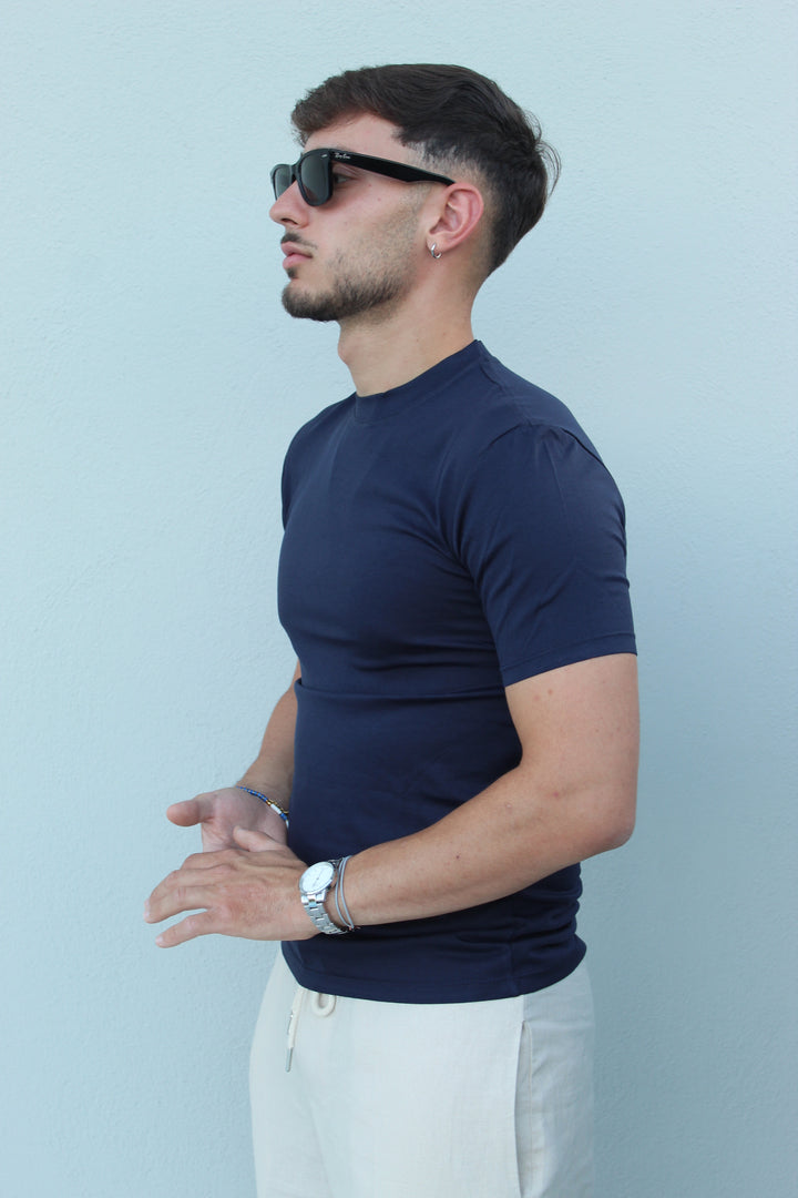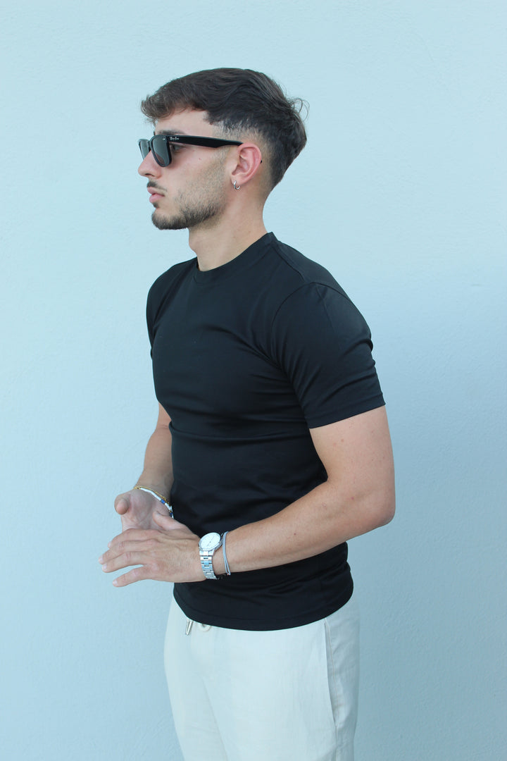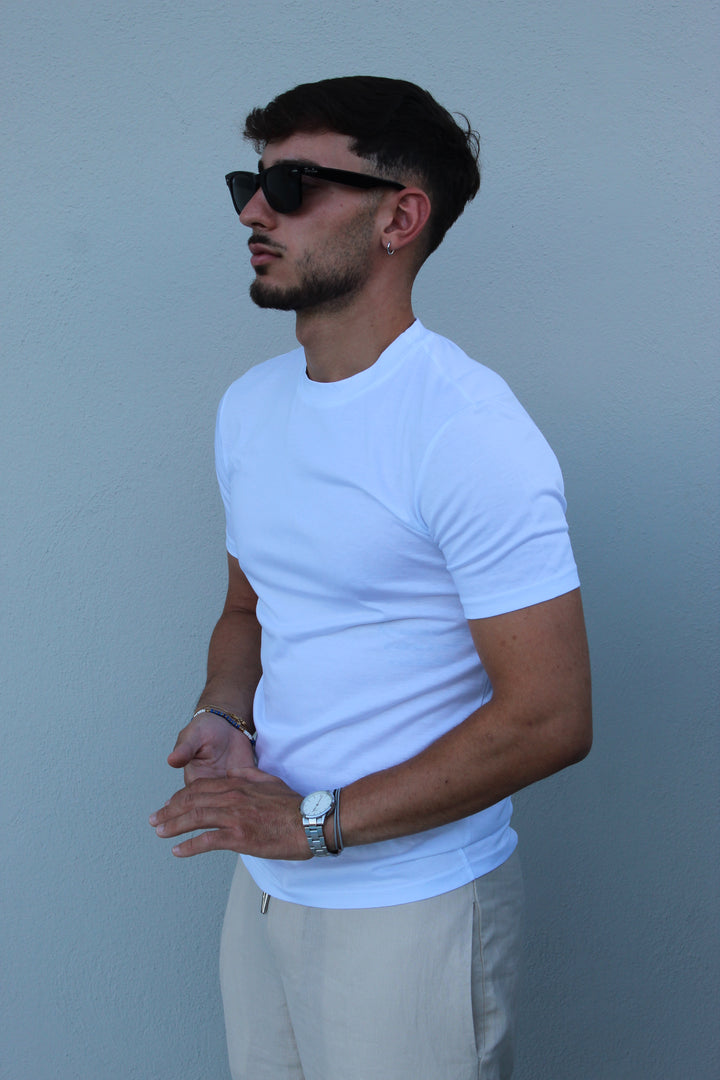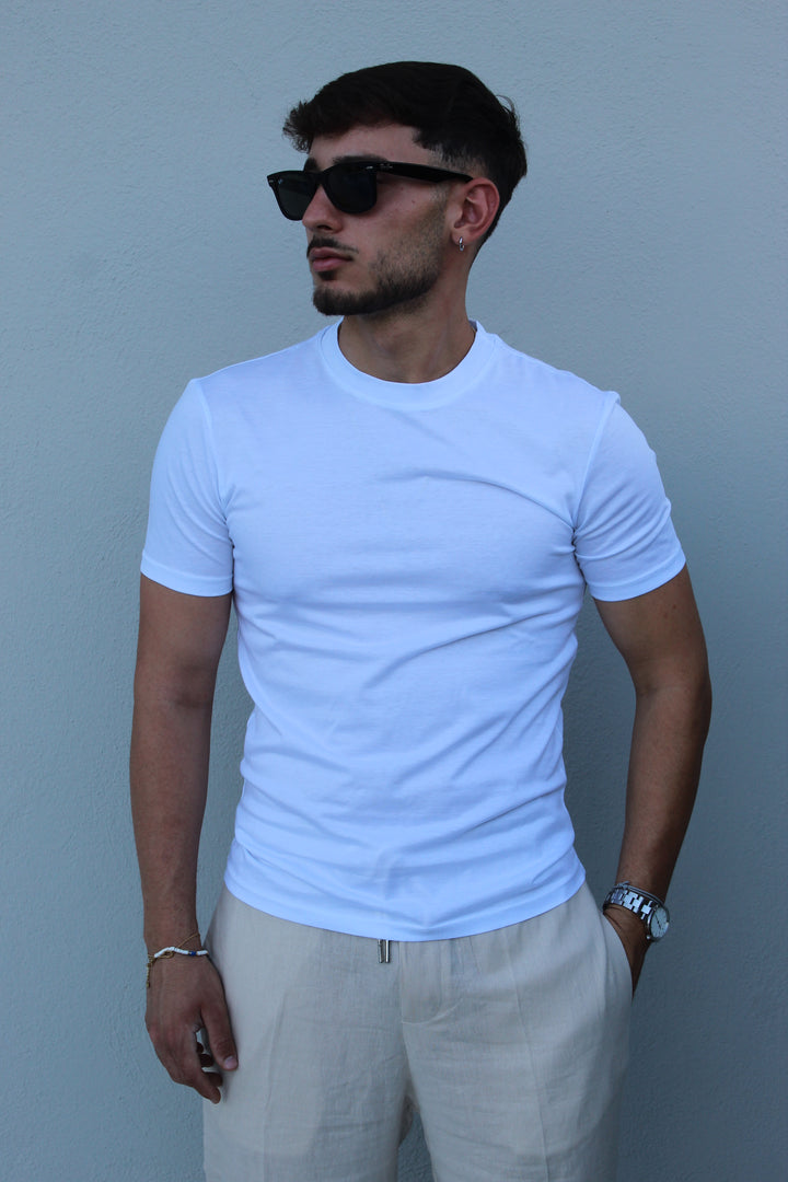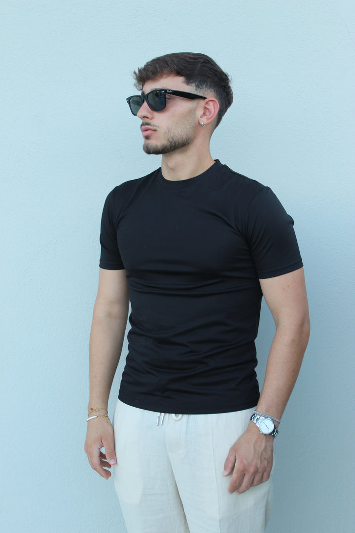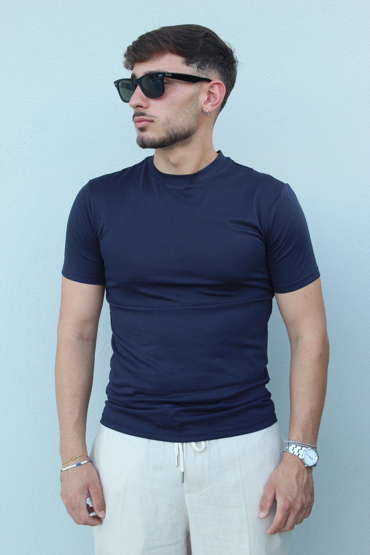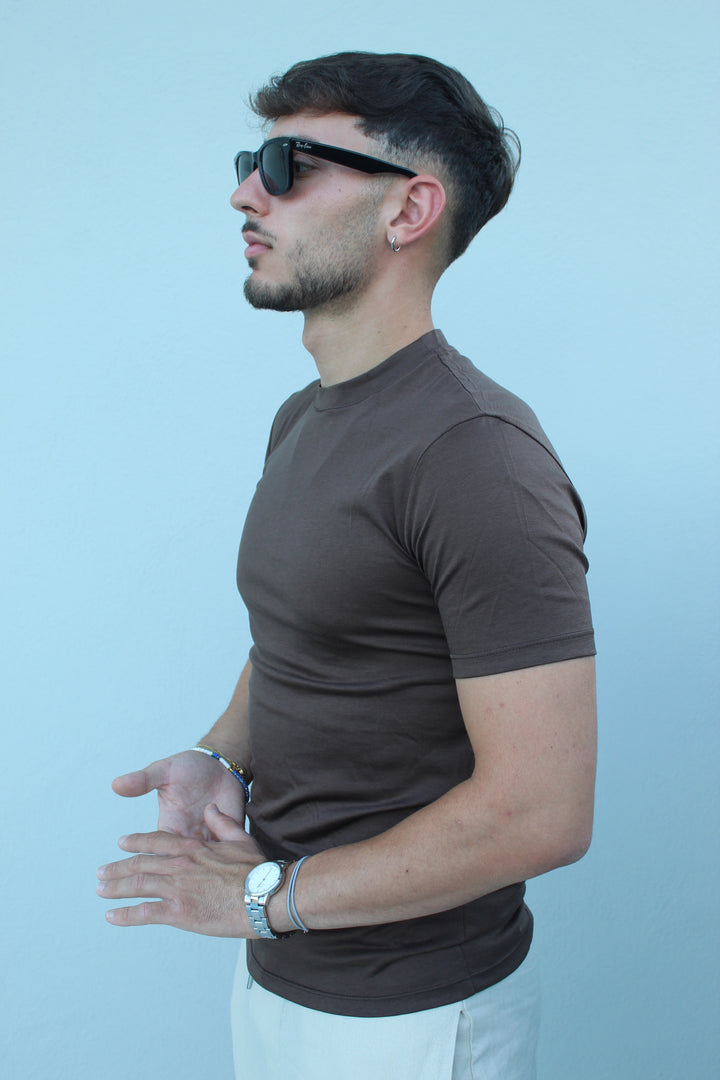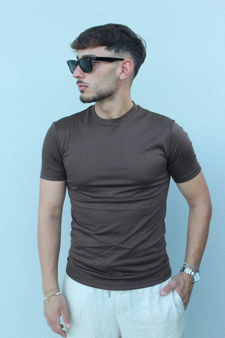 T-shirt in filo di scozia slim fit in quattro varianti di colore. Il modello in foto è alto 170 x 70 kg e indossa S.