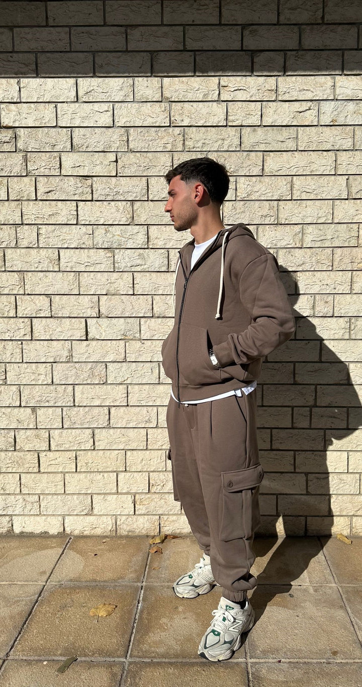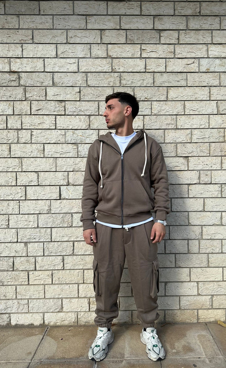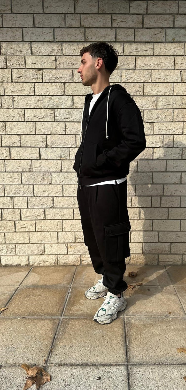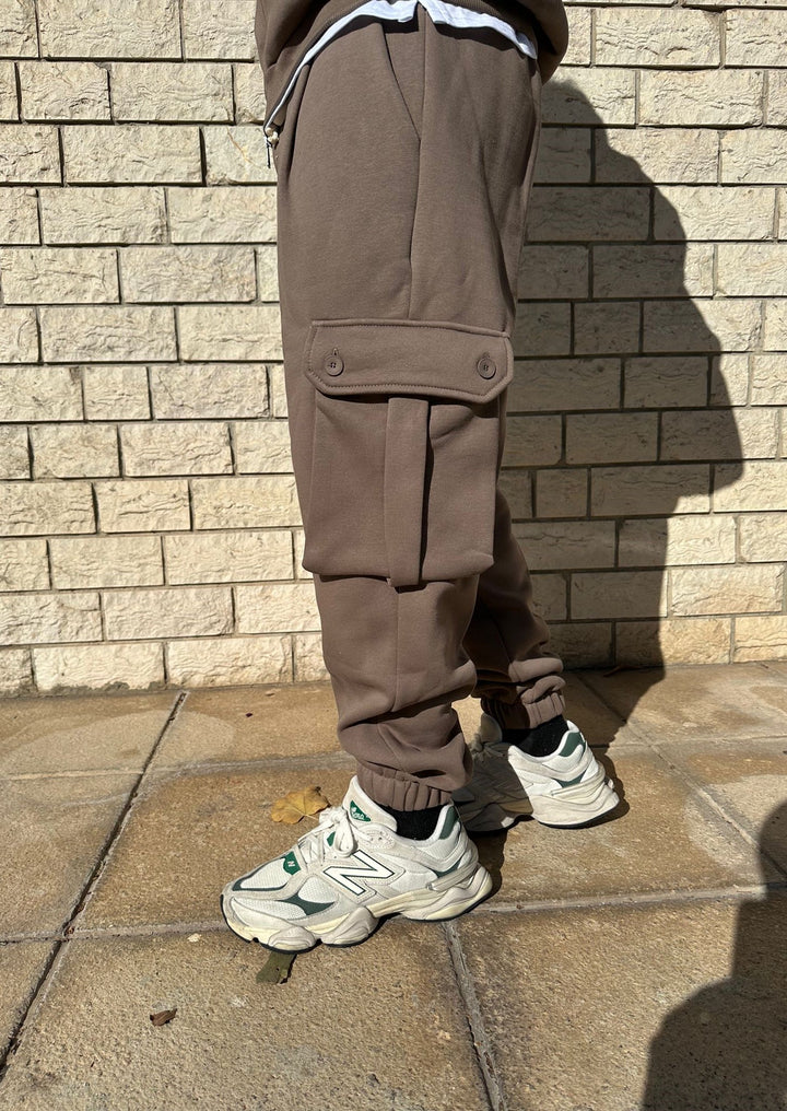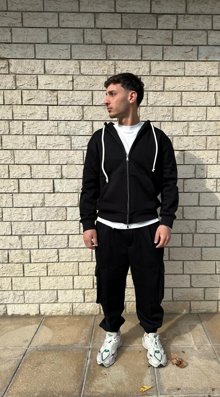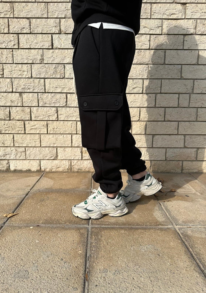Tuta Cargo in caldo cotone, molla alla caviglia e chiusura tasconi con bottoni. Il modello è alto 170 x 75 kg e indossa M.